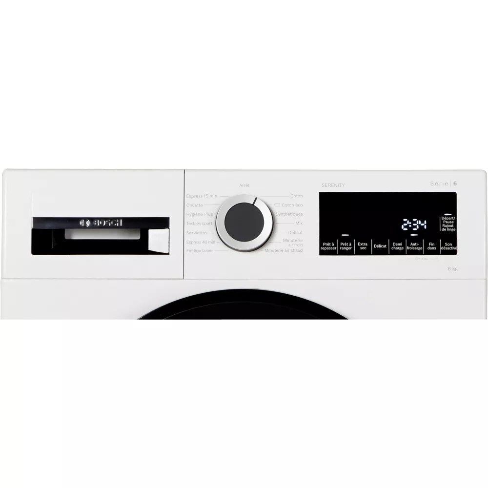 With a capacity of 8 kg, the BOSCH WPG2313SFR Serenity dryer adapts to all your needs. On the use side, the BOSCH teams designed this dryer with an optimized user experience in mind: the interface of the device equips your machine with a selection rotary knob to easily navigate among the programs of your dryer.