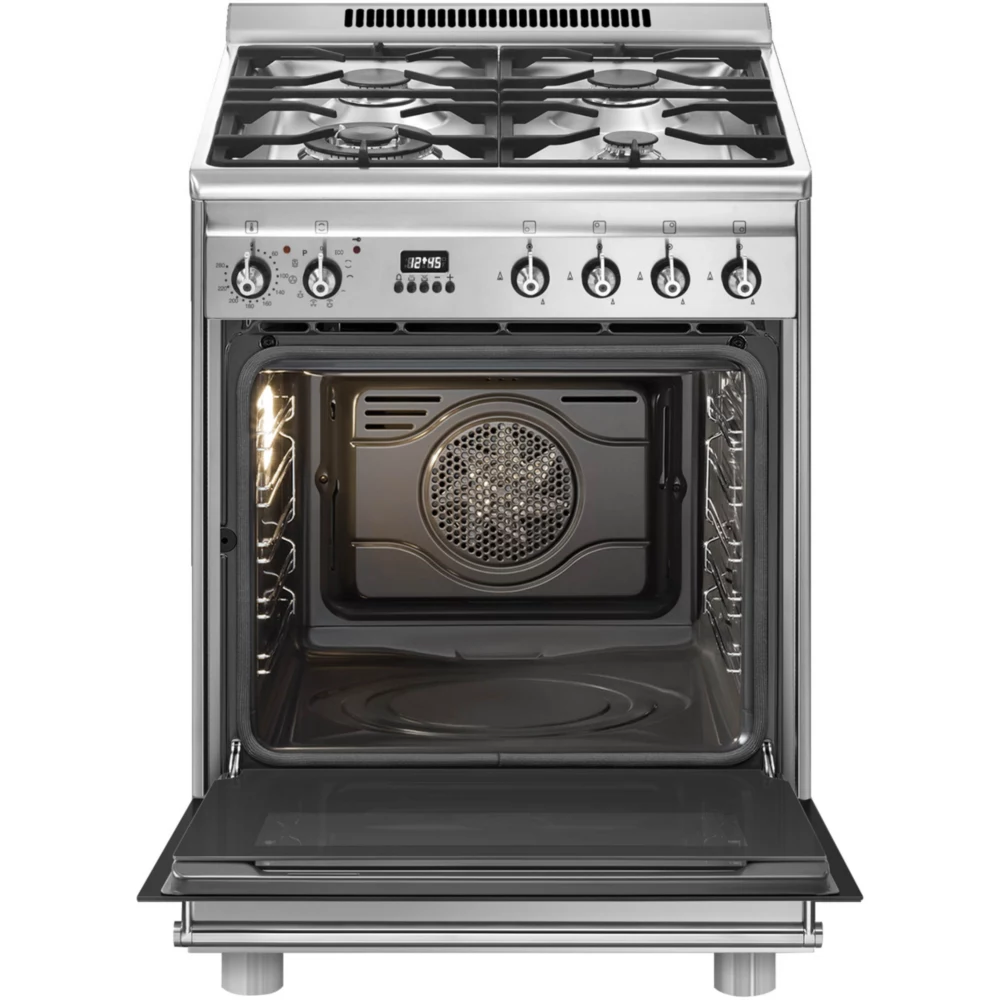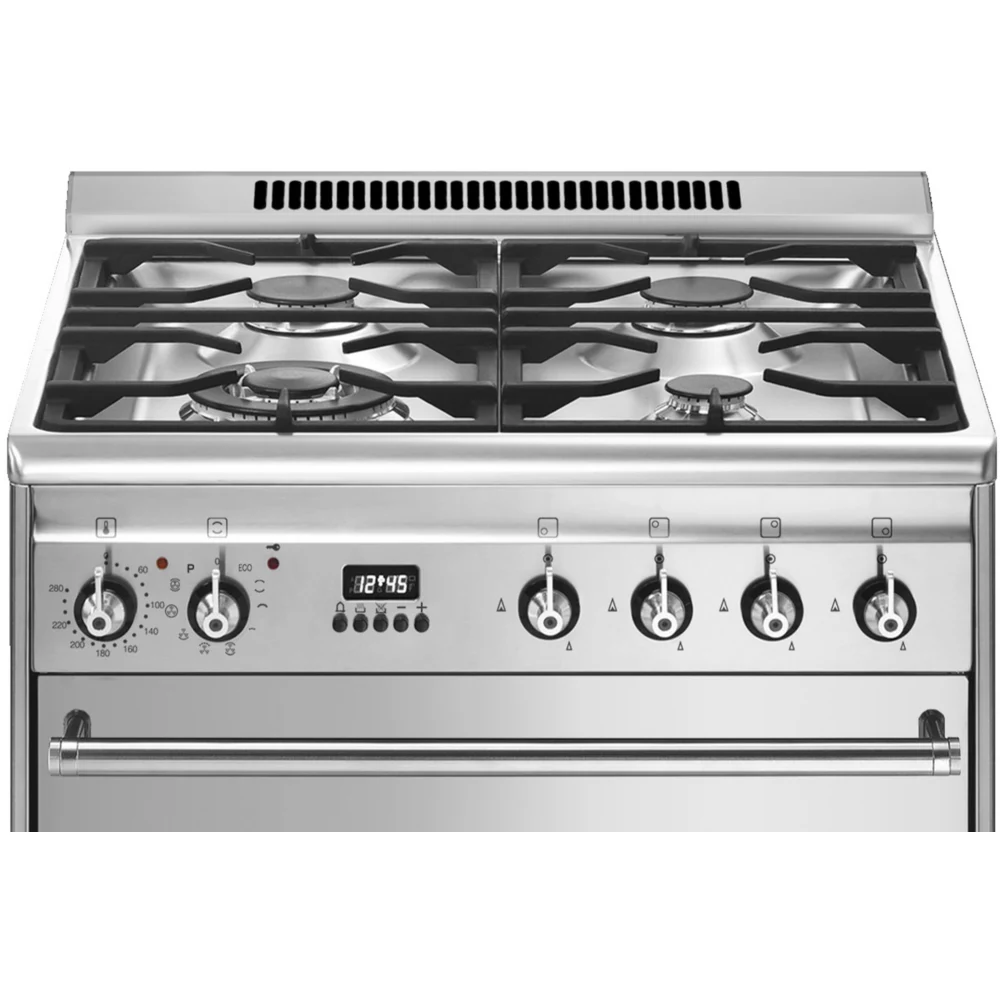 Integrated into this combination cooker, the electric oven is a technological marvel: multifunctional with convection heating, it cooks your dishes evenly and allows you to place different dishes on several levels without the risk of their flavors mixing. This oven allows you to independently adjust the temperature, cooking mode, and timing using two front knobs and a digital clock: whatever happens, you remain in control! Let's not forget to mention that the oven in this Smeg range cooker offers a pyrolytic cleaning function, an option that has become indispensable for both amateur cooks and seasoned gourmets alike.